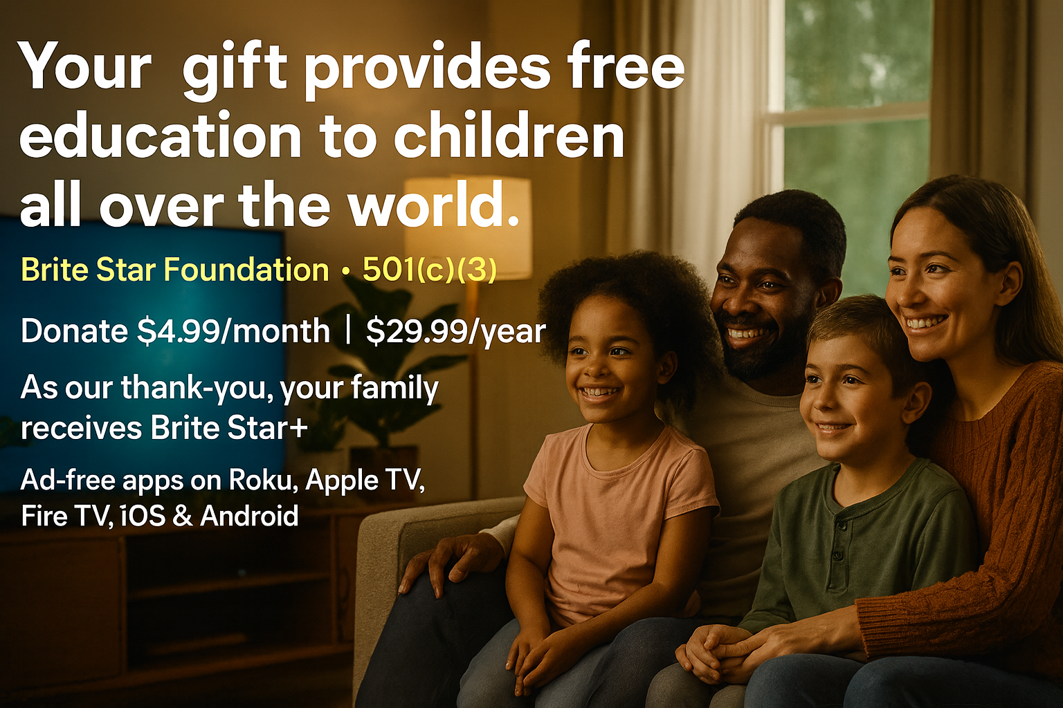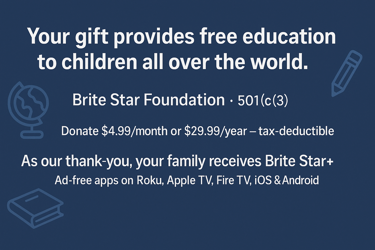 When you donate $4.99/month or $29.99/year, your gift helps us keep all Brite Star educational content free for children worldwide through our Brite Star Kids YouTube Channel.