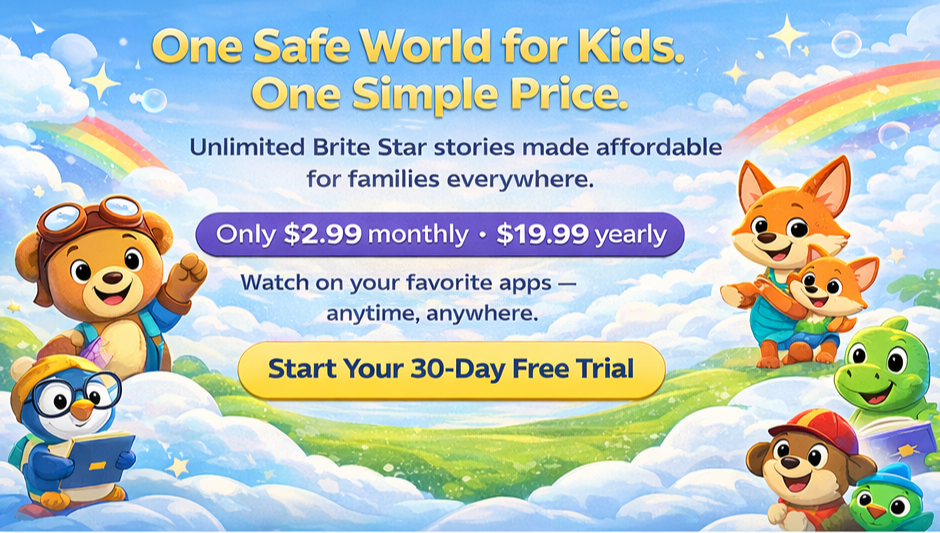 Brite Star+ is a family-friendly streaming service built with purpose β offering positive stories kids love at a price families everywhere can afford.